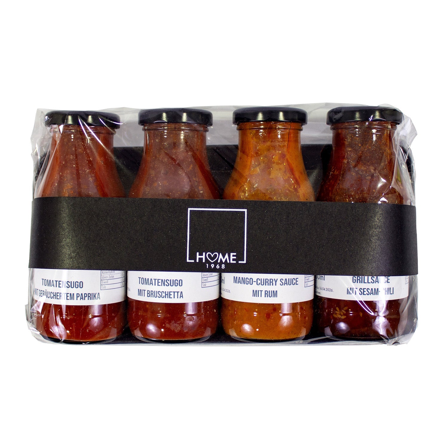 Blech & Lecker "Grill & Pasta", Inhalt: Tomatensugo mit geräuchertem Paprika 200ml, Tomatensugo mit Bruschetta 200ml, Mango-Curry Sauce mit Rum 200ml, Grillsauce mit Sesam-Chili 200ml