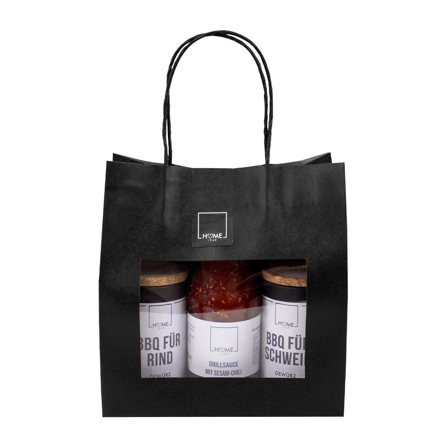 Eingetütet groß "Barbecue", Inhalt: Gewürzdose BBQ für Rind 90g, Grillsauce mit Sesam-Chili 200ml, Gewürzdose BBQ für Schwein 110g, Papiertragetasche