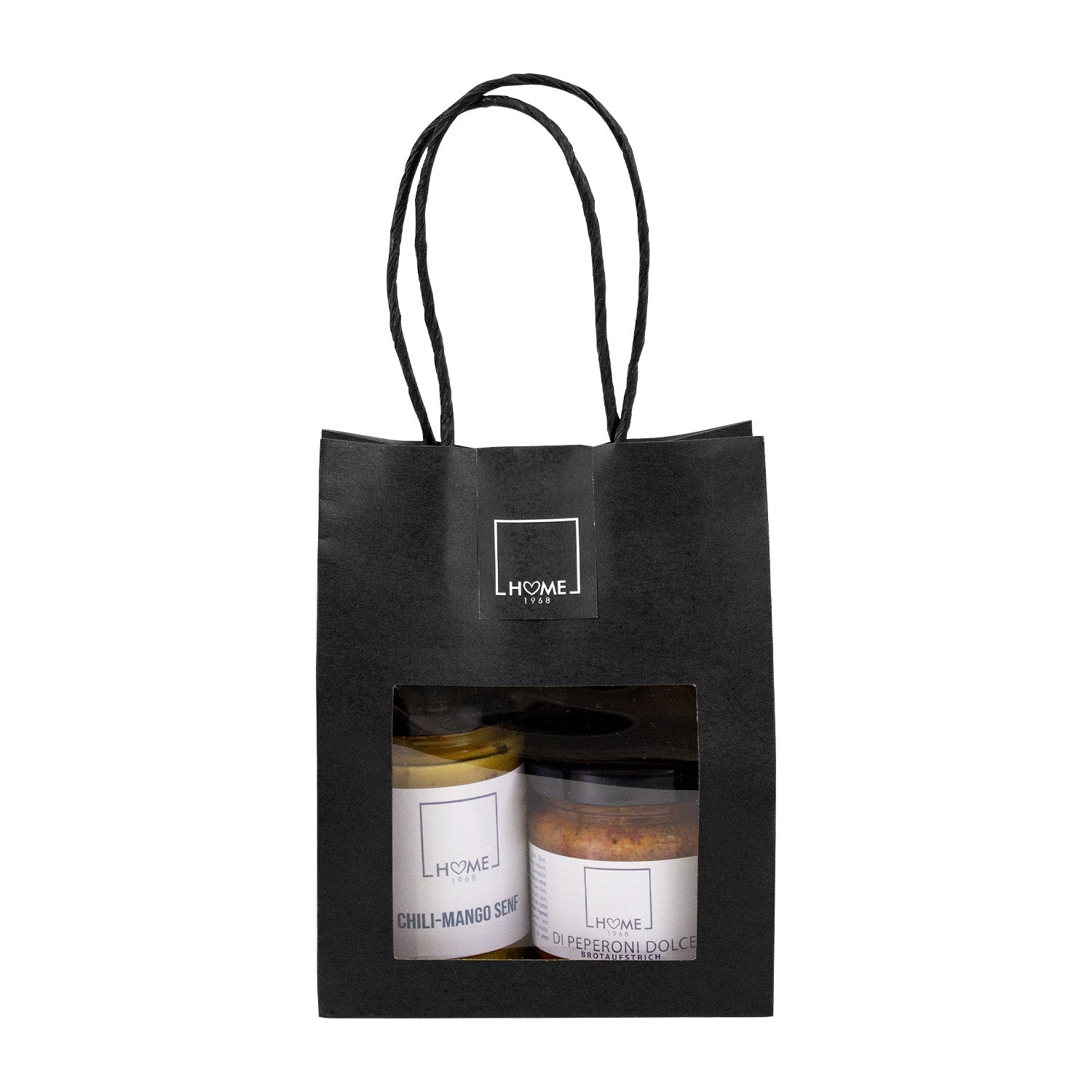 Eingetütet klein "Kulinarisch 1", Inhalt: Brotaufstrich Di Peperoni Dolce 90g, Chili-Mango Senf 100ml, Papiertasche