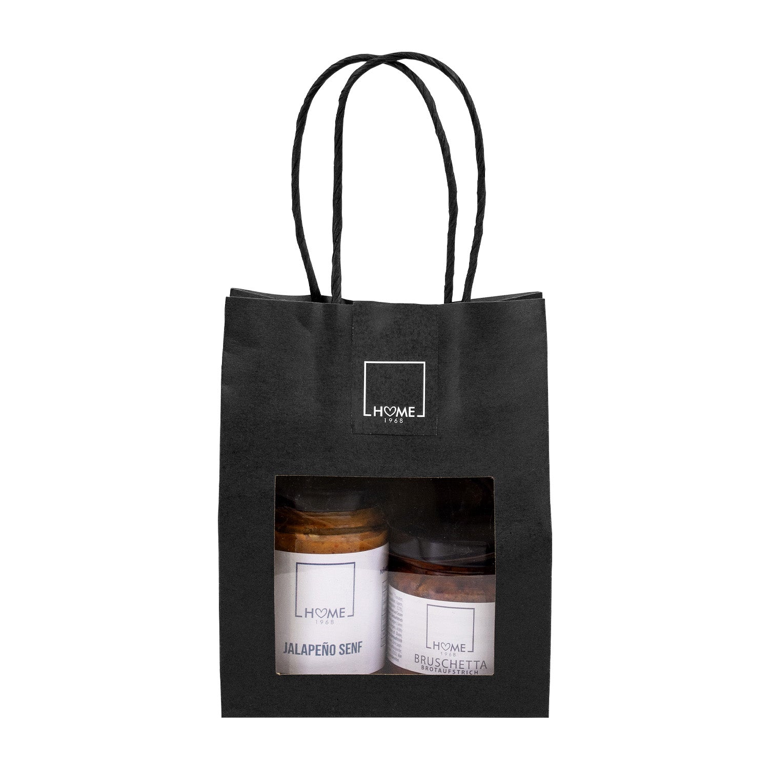 Eingetütet klein "Kulinarisch 2", Inhalt: Brotaufstrich Bruschetta 90g, Jalapeño Senf 100ml, Papiertasche