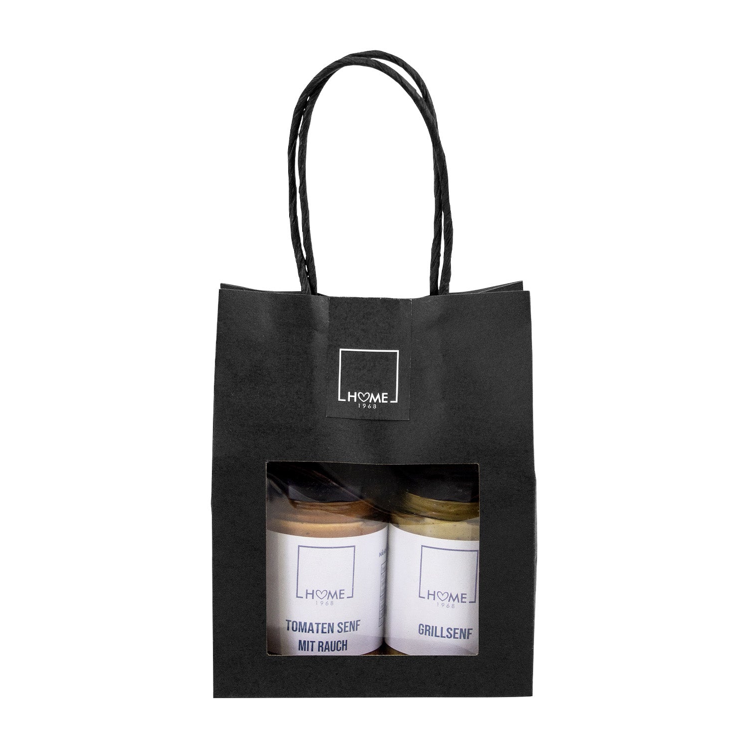 Eingetütet klein "Senf 2", Inhalt: Tomatensenf mit Rauch 100ml, Grillsenf 100ml, Papiertasche