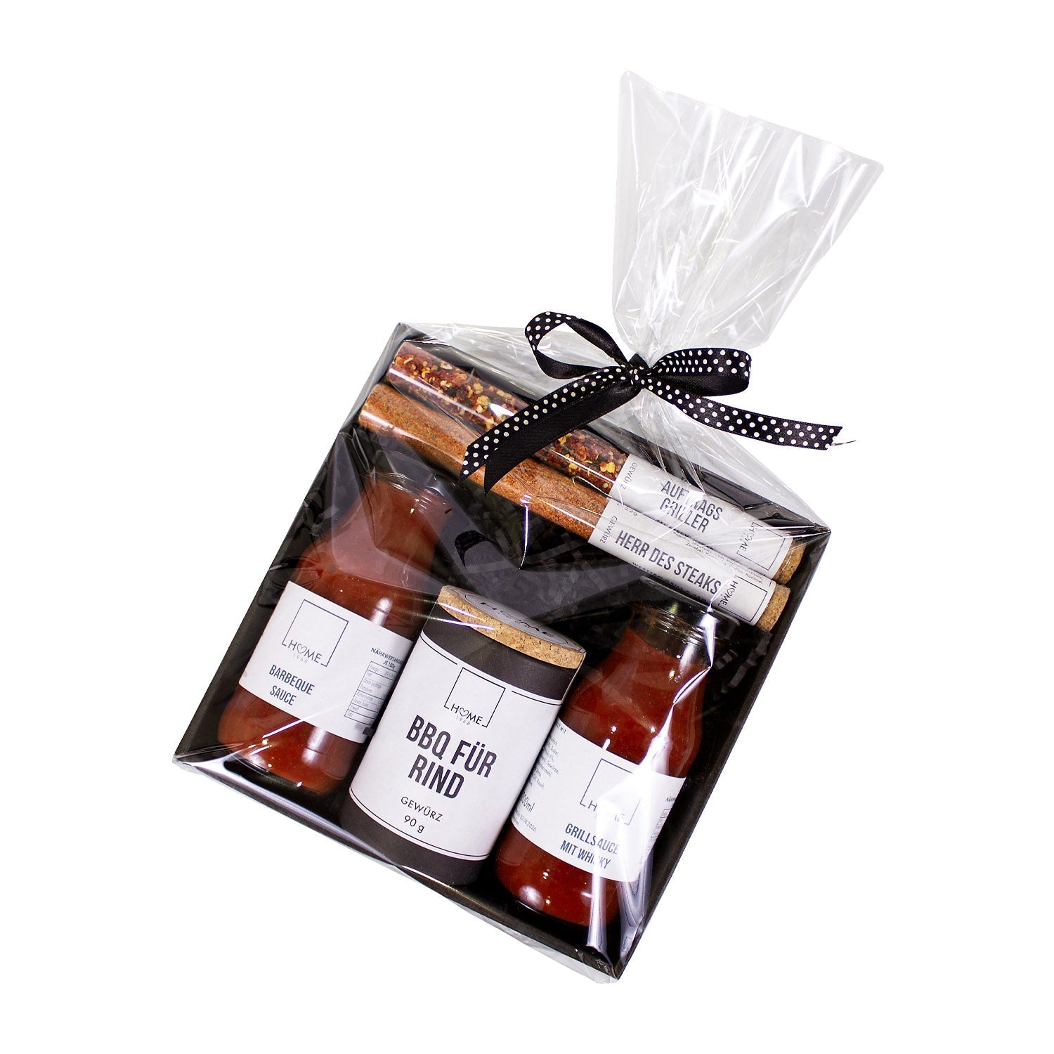 Inhalt: Barbeque Sauce 200ml, Grillsauce mit Whisky 200ml, BBQ Gewürz für Rind 90g, Vitro "Auftragsgriller" Feuerschlucker 17g, "Herr des Steaks" Western Grill & BBQ 22g
