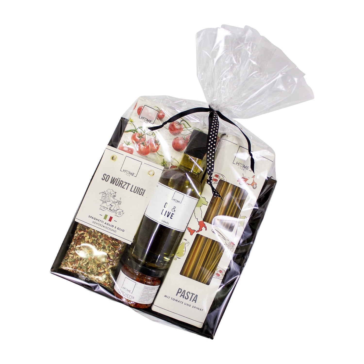 Inhalt: "So würzt Luigi" Spaghetti aglio e olio Gewürzmischung 70g, "O & Live" Natives Olivenöl extra Italien 0,2l, Bruschetta Brotaufstrich 90g, Spaghetti Tricolore (ohne Ei) 500g, Servietten "Tomatoes"