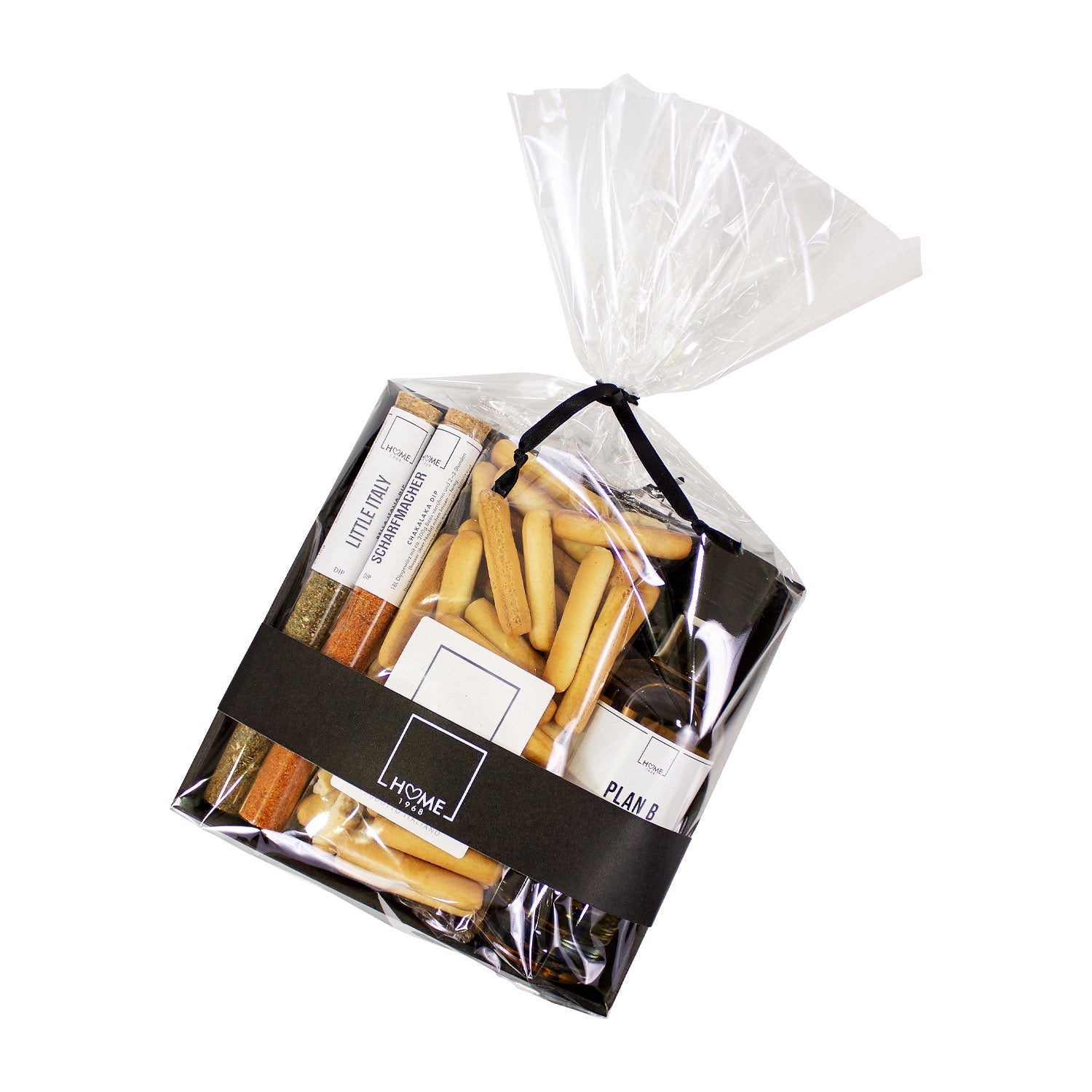 Inhalt: Mini Grissini mit Olivenöl 100g, "Plan B" Bierschnaps 0,2l, Vitro "Little Italy" Bella Italia Dip 28g, Vitro "Scharfmacher" Chakalaka Dip 22g