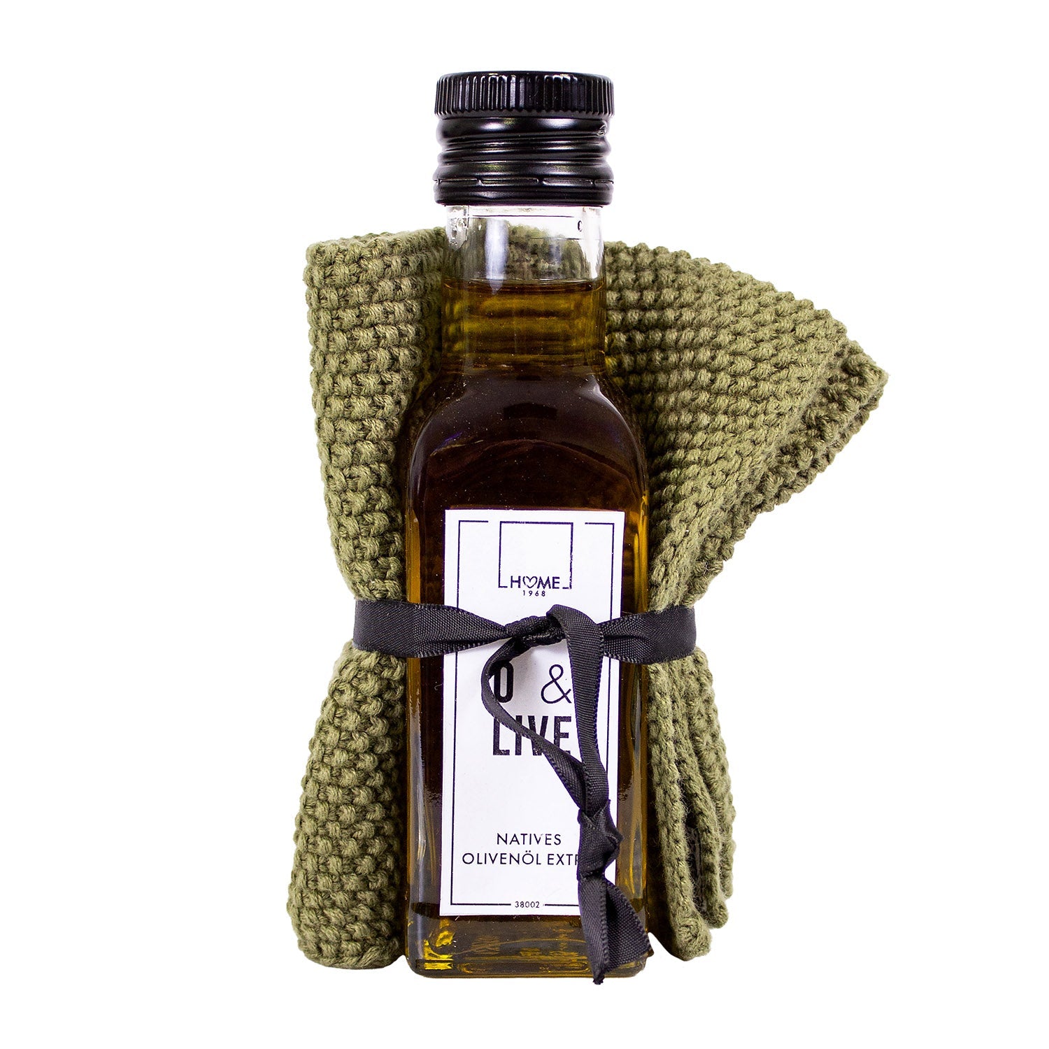 Inhalt: O & LIVE, Olivenöl aus Spanien 125ml, Spüllappen grün