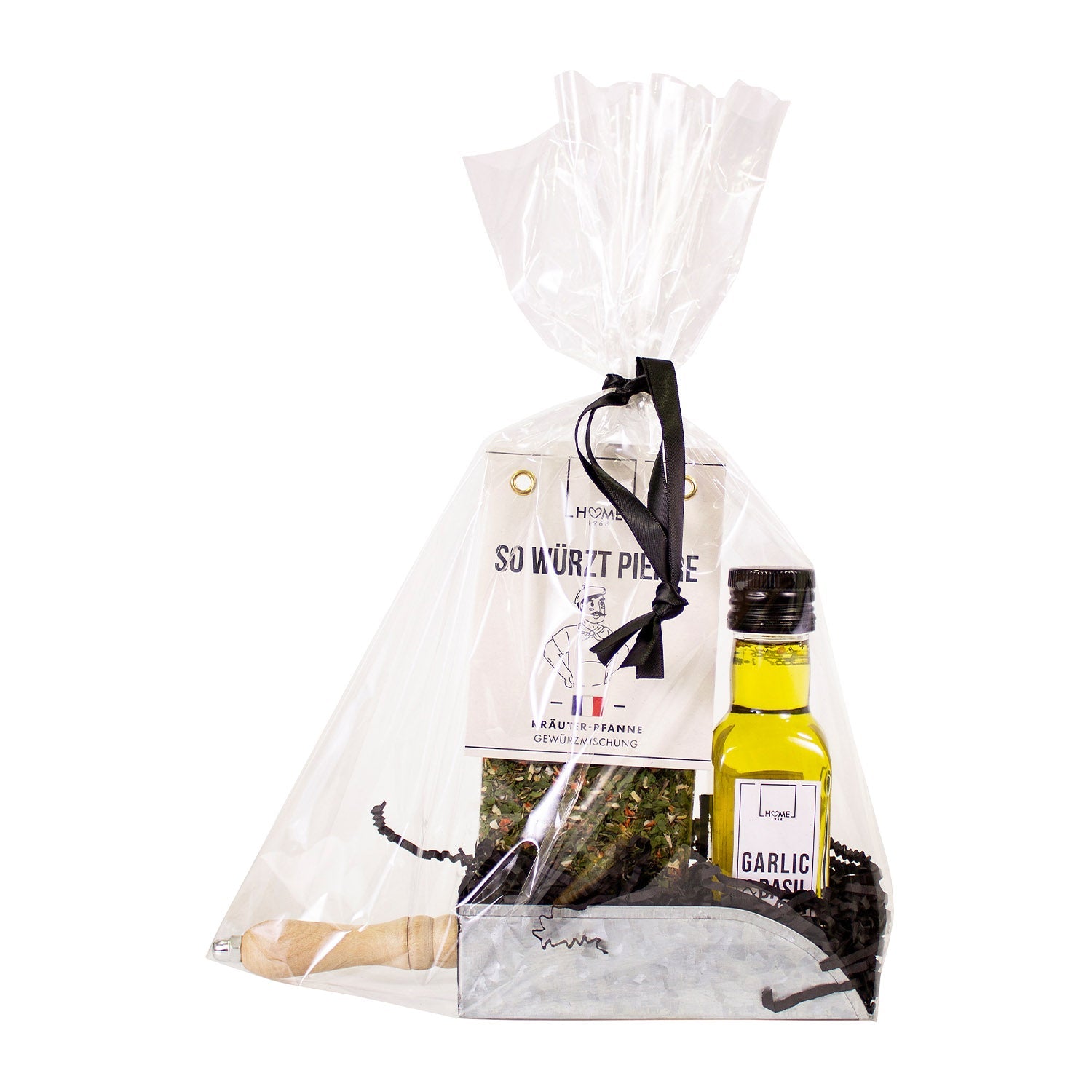 Inhalt: So würzt Pierre, Kräuter-Pfanne Gewürz 35g, Garlic & Basil, Würzöl mit Knoblauch und Basilikum 125ml